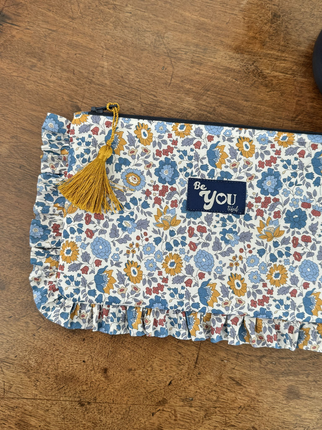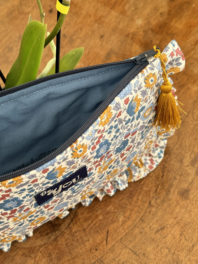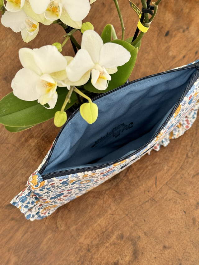 Joli tissu fleuri dans les tons bleu/jaune/rouge sur fond blanc, tissu Liberty of London.