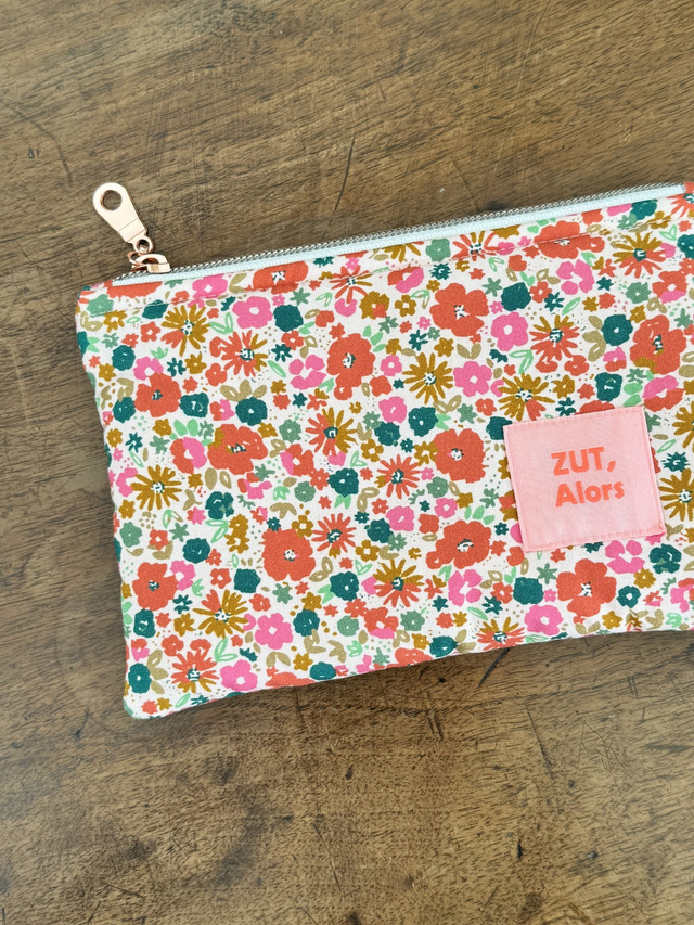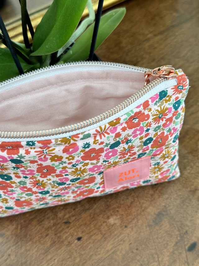 Extérieur en cotonnade fleurie type Liberty, sur fond rose pâle.