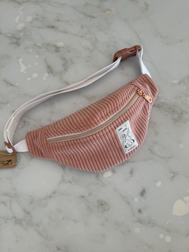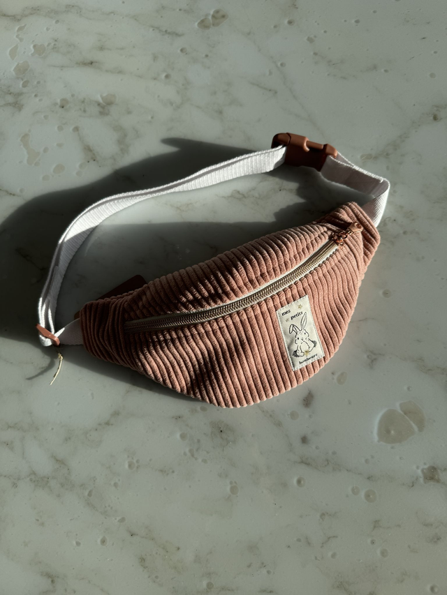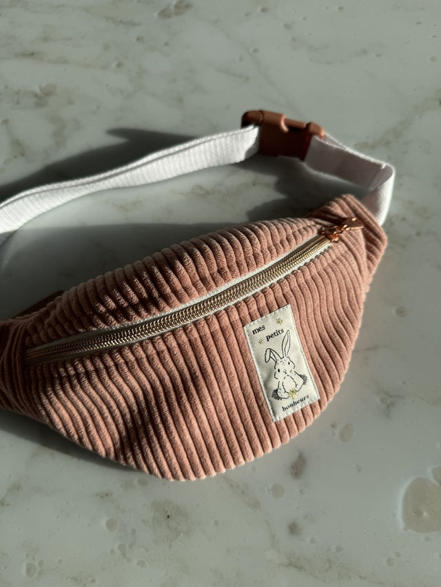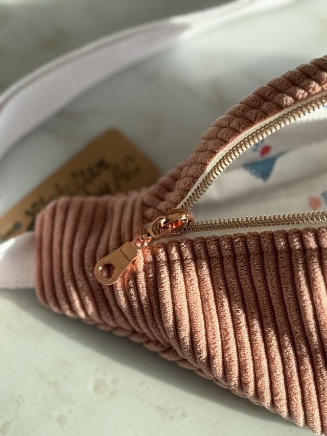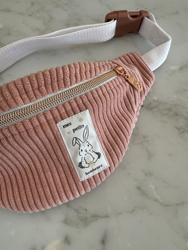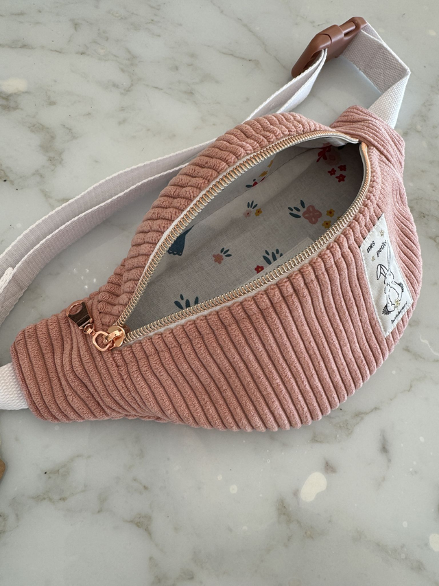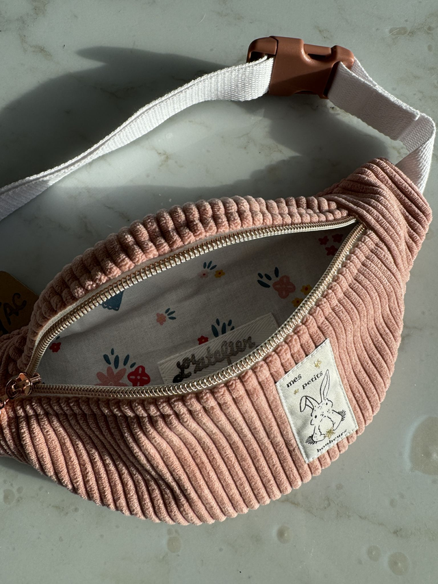 Extérieur en velours côtelé couleur rose bonbon, doublure coton imprimé de fleurs et oiseaux sur fond blanc. Etiquette décentrée "mes petits bonheurs"