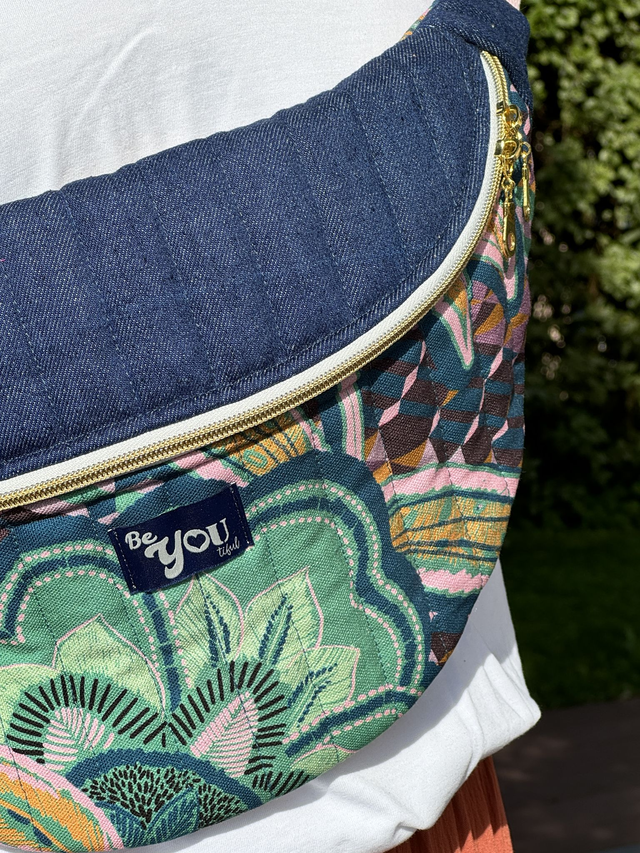 Extérieur en bachette de coton matelassée (matelassage vertical) ; motifs colorés et jean.