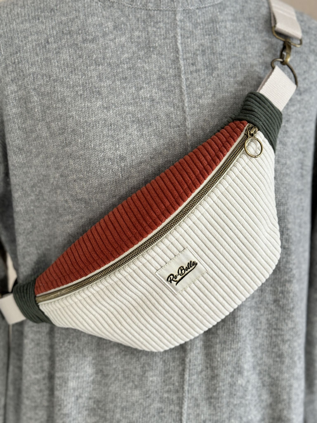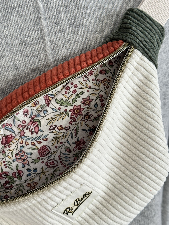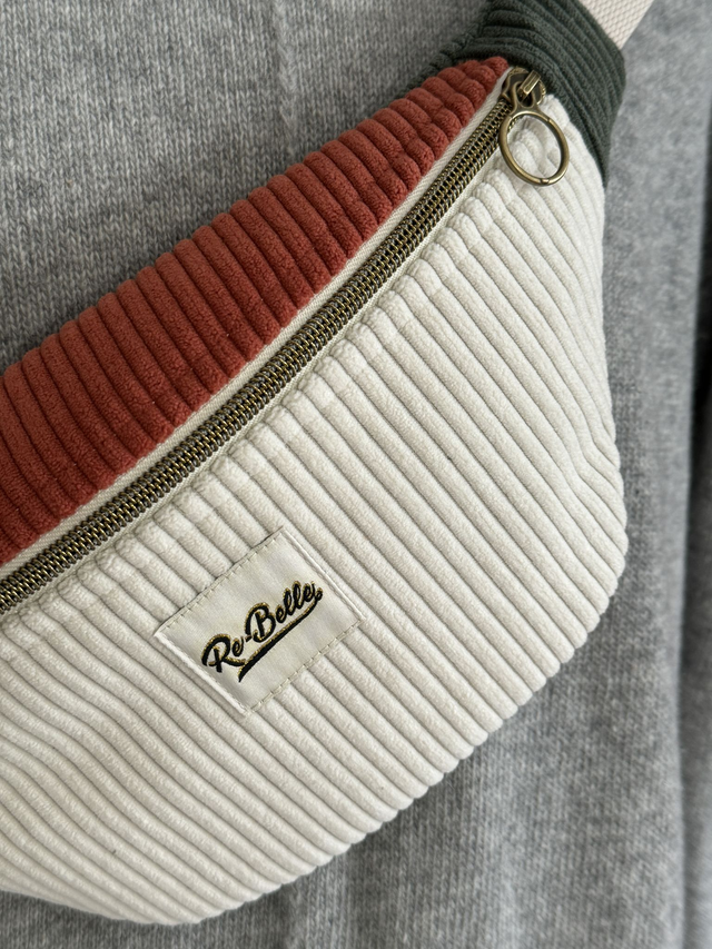Extérieur en velours côtelé, 3 couleurs : kaki, rouille et écru. Etiquette "Re-belle"