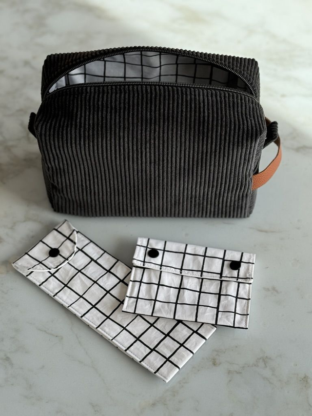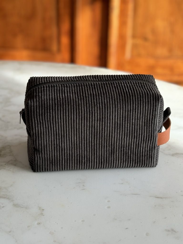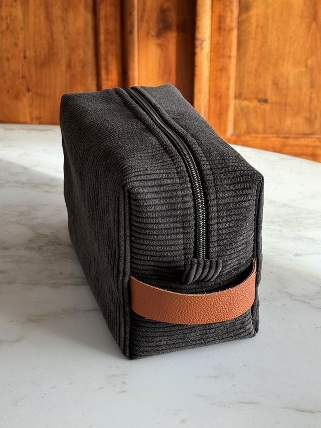 Trousse de toilette pour homme en velours côtelé noir et poignée cuir couleur cognac